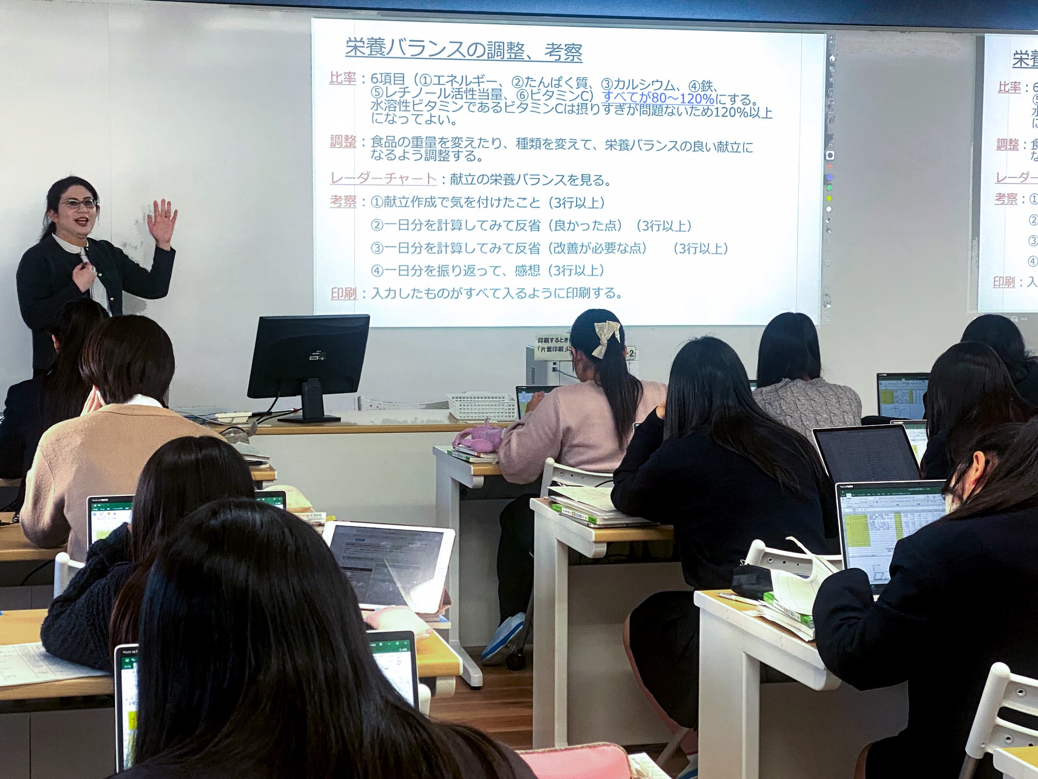 参観した高校の家庭科では「17歳女子にふさわしい一日2300kcalの献立」を、日本食品標準成分データベースを活用しながら組み立てる授業が行われていた。栄養素の六角チャートがバランスよく整うようにPC上で試行錯誤する生徒たちを、家庭科教諭と情報科教諭が連携してサポートする。従来は手計算だった作業を瞬時にチャートを確認しながら進められるのは、IT技術を効果的に活用するからだ。