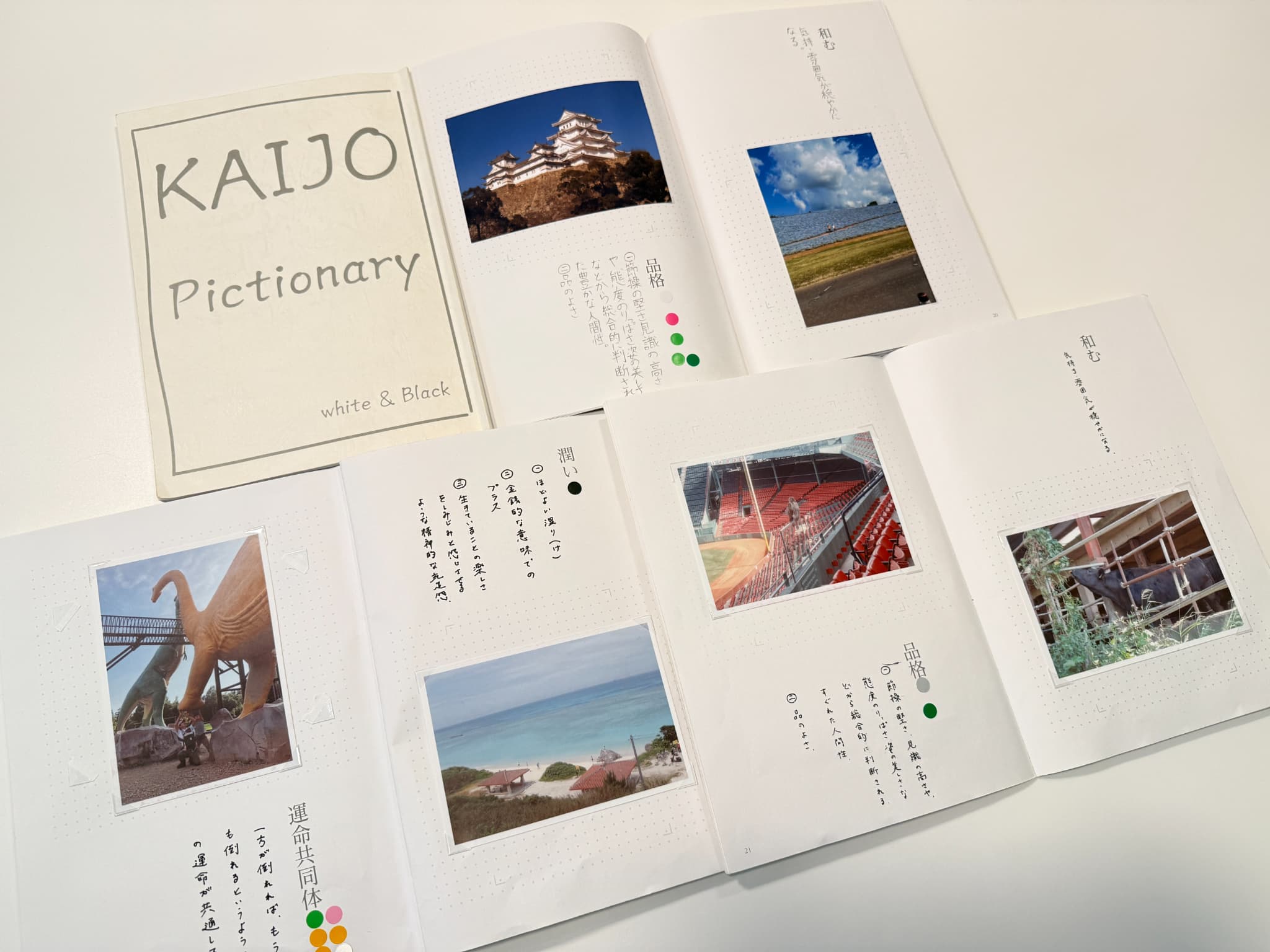 例えば、中1では夏休みの宿題として、「Picture」(写真)と「Dictionary」(辞書)を組み合わせて「Pictionary」と名づけたアルバムを完成させる。「Pictionary」には1ページに1つの言葉(「憧れる」「芸術」「潤い」など)が記されており、その下には写真を貼り付けるスペースがある。生徒たちは言葉の意味を辞書で調べて書き込み、その言葉にあわせた写真を貼る。同じ「憧れる」でも、自分が憧れの対象の写真を貼る生徒もいれば、憧れている対象を見つめる人の姿を撮影する生徒もいる。同じ「芸術」でも、何を芸術とするかは様々だ。夏休み明けには、それぞれが作ってきた「Pictionary」を鑑賞し合う。多様な解釈を共有する中で、同じ言葉でも、それが喚起するイメージが人によって異なること、見え方が変わることに気づくことになる。